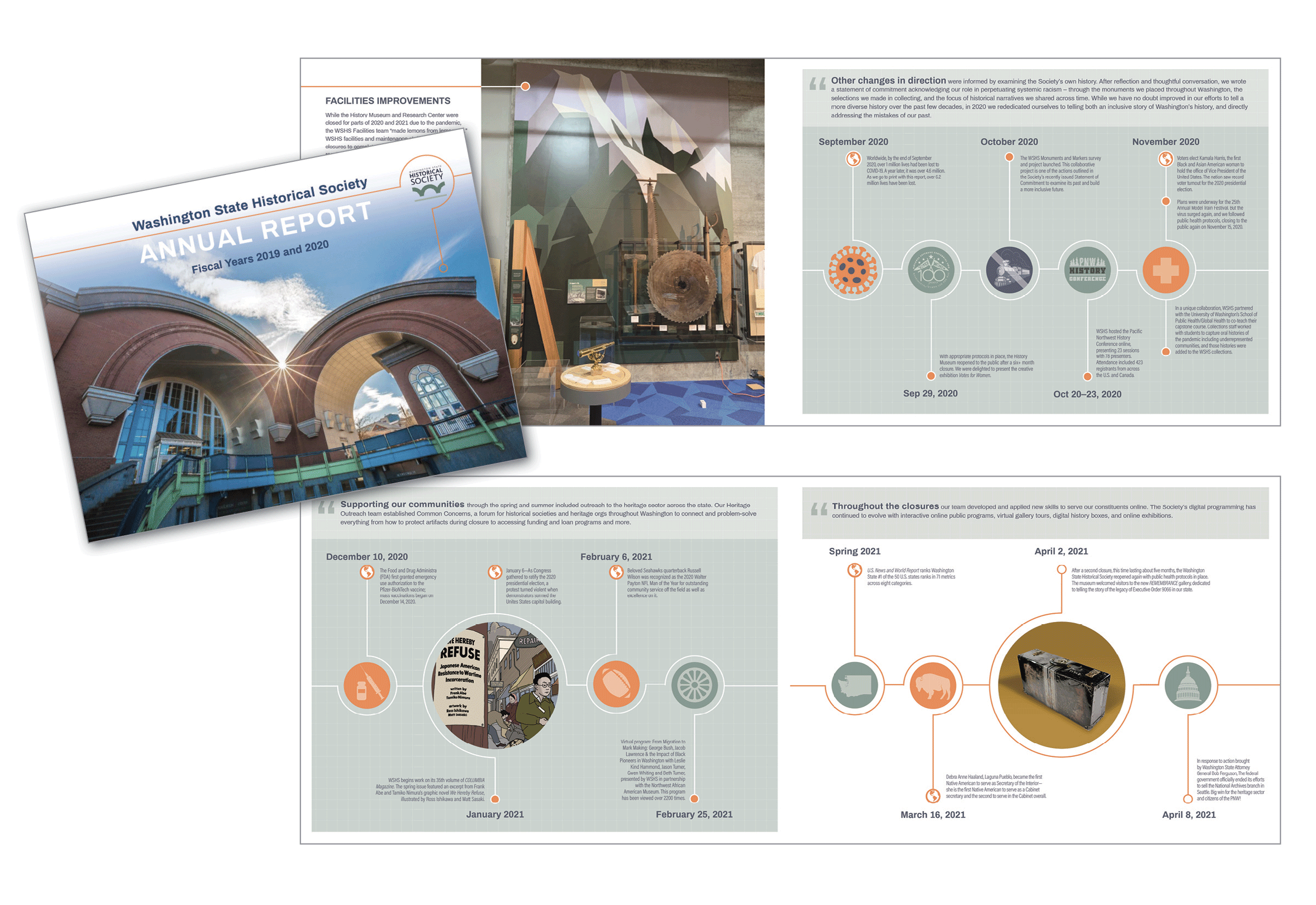 Designed annual report for the Washington State Historical Society and related marketing materials, including interactive online adaptation. Features design of timeline infographics and original illustrated elements.
