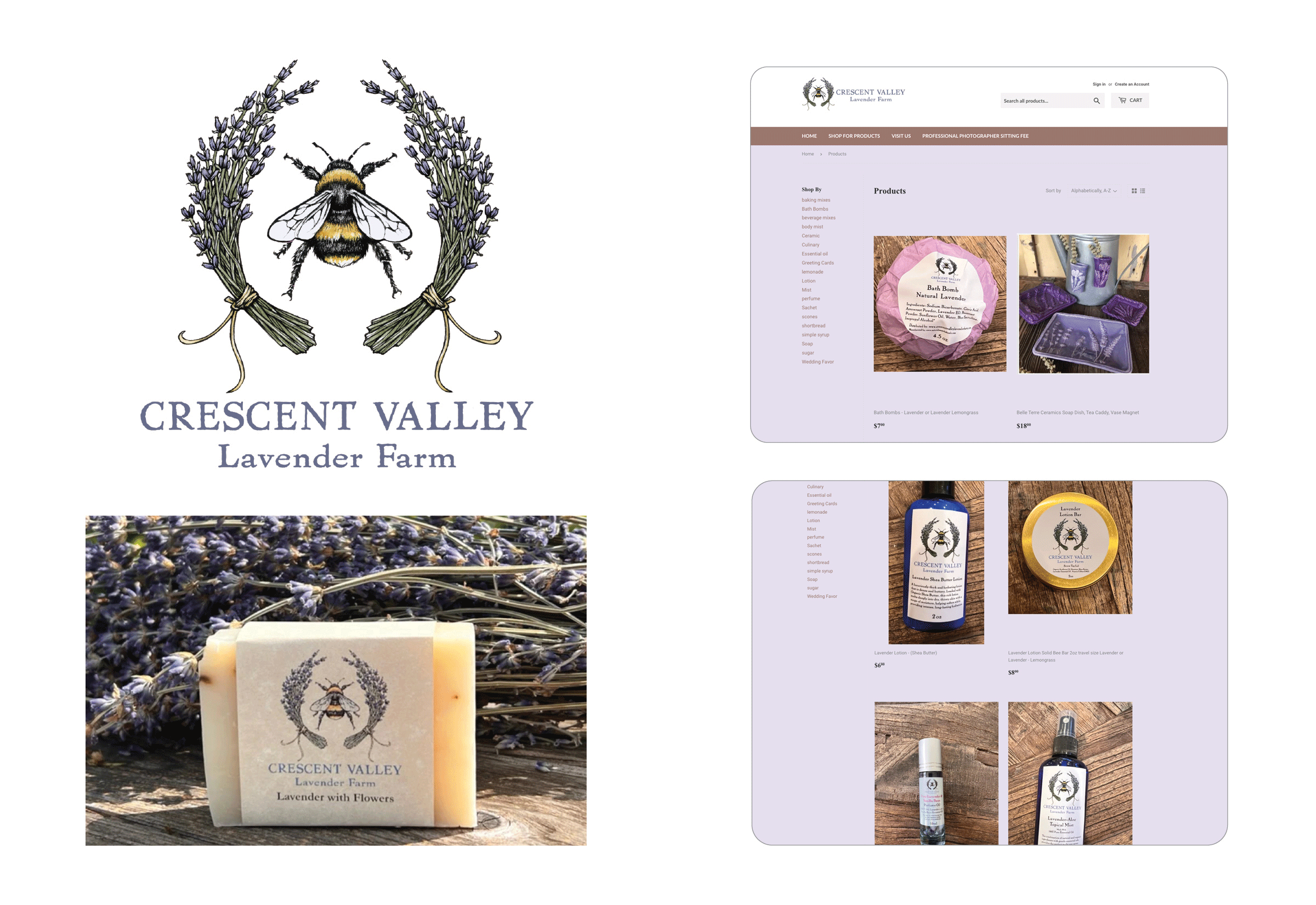 Designed and illustrated logo for Crescent Valley Lavender Farm. Developed branding guidelines for packaging, and print and digital marketing. Features original illustrations.